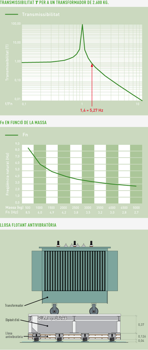 El disseny d’aquesta llosa flotant antivibratòria ofereix una solució efectiva i definitiva per a l’aïllament a la transmissió de vibracions de cossos pesants, com són els transformadors, en el seu recolzament.