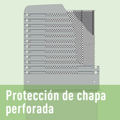 Protección interior consistente en dos chapas perforadas superpuestas a modo de filtro. De ideal instalación en lugares donde exista riesgo de caída de objetos o suciedad al interior del recinto a ventilar.